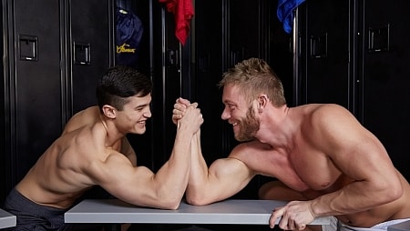 With a mouth full of dick he looks up at masculine Dawson for approval, and he sure gets it as Dawson moans his appreciation for blowing skills. Colt may whimper a bit when he finally gets Dawson inside him, but regardless of how rough and hard Dawson thrusts, Colt’s bottom is hungry for more! Dawson can’t get enough of his tight perky ass as he looks for different ways to own it. Muscles abound in this steamy locker room session and it comes to an epic end when Dawson scoops up his entire load from his Colt’s abs- and drops it right into Colt’s mouth to swallow!
